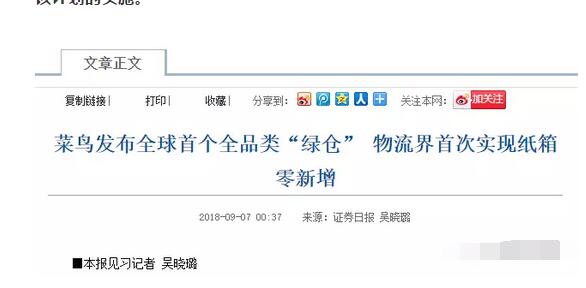 9月6日,菜鳥宣布,其打造的全球第一個全品類“綠倉”已經在寧波投產。除了接收商品原包裝的紙箱外,該倉庫不再新增任何紙箱,而是使用循環次數可達10次以上的循環箱,目前已經覆蓋倉內數萬SKU(筆者注:每款商品都有一個SKU,便于淘寶識別商品)。 此外,菜鳥將啟動全新升級的“回箱計劃”,范圍將拓展到全國百城5000個回收點。淘寶、高德、支付寶、菜鳥裹裹將從2018“雙11”起全面支持該計劃的實施。