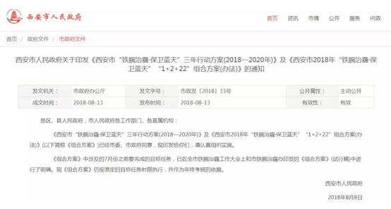 西安市 西安市人民政府印發(fā)《西安市“鐵腕治霾·保衛(wèi)藍天”三年行動方案(2018—2020年)》及《西安市2018年“鐵腕治霾·保衛(wèi)藍天”“1+2+22”組合方案(辦法)》。方案提出,禁止新建、擴建燃煤發(fā)電、燃煤熱電聯(lián)產(chǎn)和燃煤集中供熱項目,禁止新建、擴建和改建石油化工、煤化工、水泥、焦化項目。