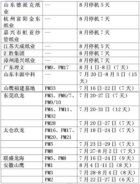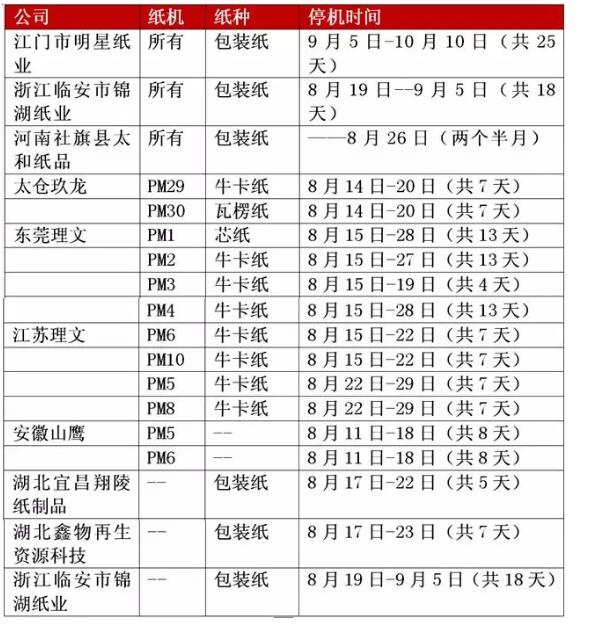 9月原本是包裝紙的傳統(tǒng)旺季,在中秋和國慶雙節(jié)利好帶動下,紙板廠在8月中旬曾出現(xiàn)過短暫半月的采購小高潮。但隨著8月底補貨提前結(jié)束,市場再度回歸平淡,旺季的需求疲軟逐漸給紙企帶來庫存壓力,規(guī)模紙企利潤縮減,而多數(shù)中小紙企利潤難保,無奈之下,部分紙企開始采取小幅降價或停機措施。 廣東又一規(guī)模紙廠停機:9月15日起全廠停機25天 江門市豐達(dá)紙業(yè)有限公司/江門市明星紙業(yè)有限公司:為了給廣大客戶提供更優(yōu)質(zhì)的原紙,我司決定于2018年9月15日-2018年10月10日進(jìn)行紙機技術(shù)改造及電站檢修維護(hù),全廠停機25天。請各客戶提前做好用紙安排!據(jù)悉該廠有5條造紙生產(chǎn)線。 旺季停機檢修似乎已成為今年的主旋律。華印小編不完全統(tǒng)計發(fā)現(xiàn),7月至今停機檢修的紙機多達(dá)60臺左右。其中,時間最長的停機時間長達(dá)約75天(兩個半月),短的也有一周左右。停機原因包括:停產(chǎn)保價、響應(yīng)政府節(jié)能減排號召、環(huán)保督察下的鍋爐檢修等,但據(jù)紙板廠透露大多數(shù)紙廠停機是因為下游需求縮水引起的去庫存或利潤縮水后的保價需要。