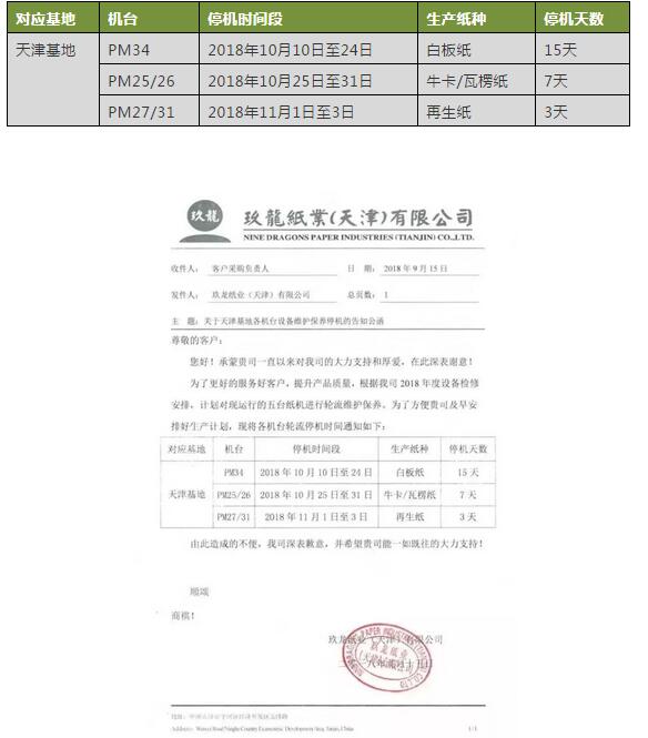 近期包裝紙市場低迷,東莞玖龍、天津玖龍、晨鳴集團、博匯紙業、萬國紙業等相繼發布停機通知或暫停發貨通知,未免讓人聯想到是為了拯救價格。 玖龍、晨鳴、博匯等龍頭相繼發布停機或暫停發貨通知 東莞玖龍、天津玖龍、晨鳴集團、博匯紙業、萬國紙業等相繼發布停機通知或暫停發貨通知,東莞玖龍國慶期間10月1日-3日三天停止發貨,天津玖龍10月10日至11月3日期間,五天紙機輪流停機,涉及白板紙、?、瓦楞紙、再生紙,共計停機25天。晨鳴集團、博匯紙業、萬國紙業則是白卡紙機停機7天。 玖龍紙業天津公司:為更好服務客戶,提升產品質量,根據公司2018年度設備檢修安排,計劃對現運行的五臺紙機進行輪流維護保養。現將各機臺輪流停機時間通知如下: