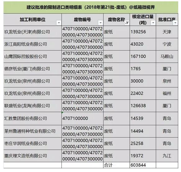 9月29日,中國固廢中心公布的2018年第21批限制進口明細,此次審核通過了玖龍紙業(天津)有限公司、浙江高陽紙業有限公司、山鷹國際控股有限公司、德彥紙業(廈門)有限公司、玖龍紙業(泉州)有限公司、聯盛紙業(龍海)有限公司、匯勝集團股份有限公司、萊州魯通特種紙業有限公司、棗莊華潤紙業有限公司、重慶理文造紙有限公司,10家紙廠共獲核準總量為60.3844萬噸。