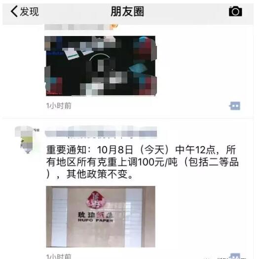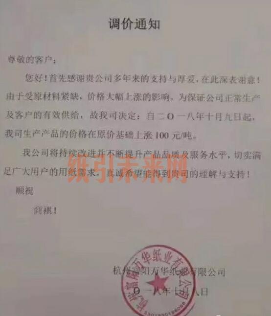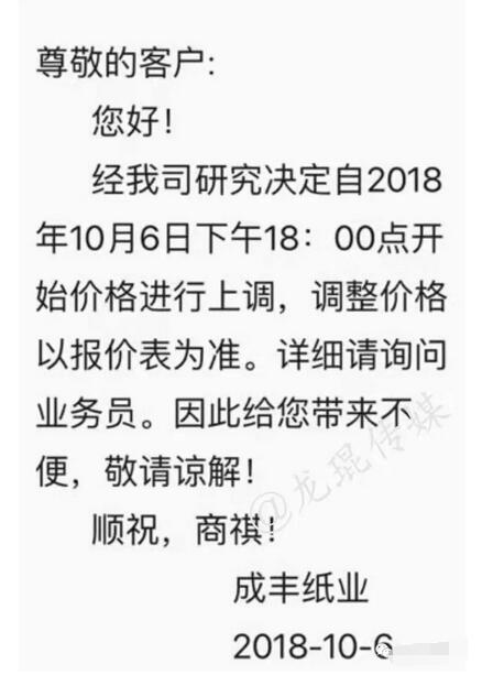 揭陽市成豐紙業有限公司:自2018年10月6日18:00開始,價格進行上調,調整價格以報價表為準。