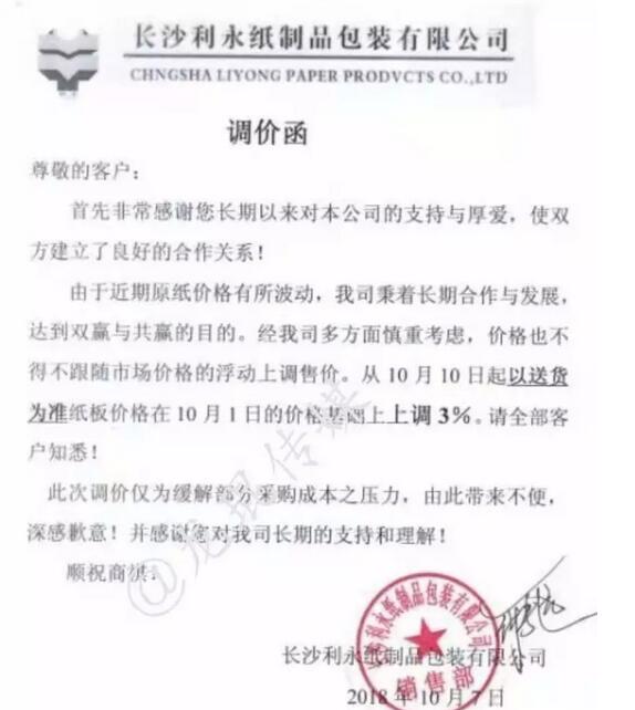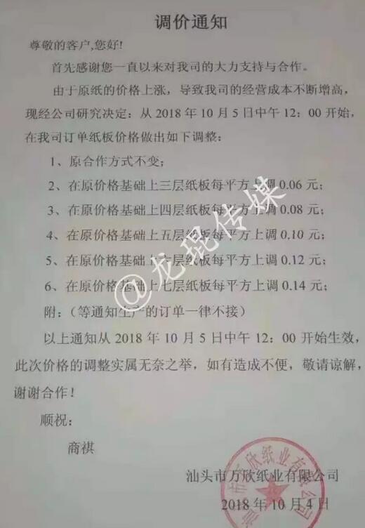 汕頭市萬豐紙品實業有限公司:從2018年10月5日中午12點起,兩層紙板價格每平方上調0.04元;三層紙板價格每平方上調0.06元;四層紙板價格每平方上調0.08元;五層紙板價格每平方上調0.10元;六層紙板價格每平方上調0.12元;七層紙板價格每平方上調0.14元。等通知生產的訂單一律不接。