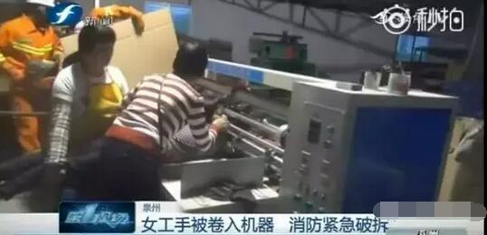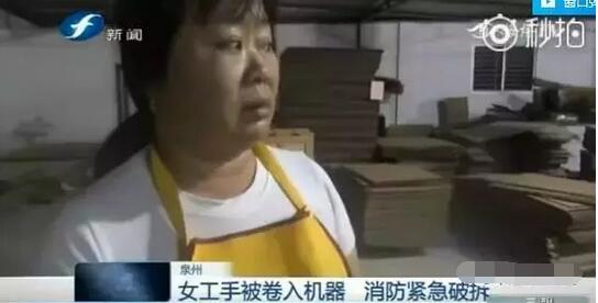 近日,又一起安全事故發生。據泉州網消息,在福建省泉州市臺商投資區張坂鎮下鋪村八方食品廠紙箱車間內,一名工人的手臂被卷入分紙機,當場昏厥。 女工手臂被卷入分紙機,所幸已獲救 10月14日17時40分左右,泉州臺商投資區張坂鎮下鋪村八方食品廠紙箱車間內,一名工人的手臂被卷入分紙機。接到報警后,臺商投資區消防大隊迅速趕赴現場救援。