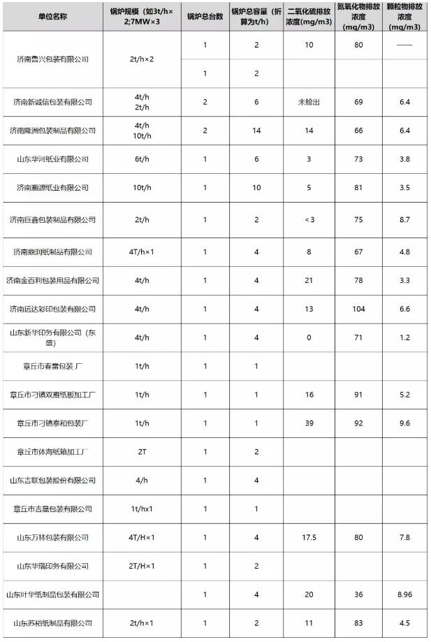 根據(jù)濟(jì)南市環(huán)保局要求,濟(jì)南市燃?xì)忮仩t低氮改造和生物質(zhì)鍋爐超低排放改造的截止日期是2019年10月底,環(huán)保局所羅列出的全市鍋爐排查情況表中包含的企業(yè),有20家包裝廠,其排放標(biāo)準(zhǔn)不符合要求的,需按要求按標(biāo)準(zhǔn)在規(guī)定時間內(nèi)完成改造任務(wù)。 山東濟(jì)南市鍋爐改造標(biāo)準(zhǔn)和時間定了! 8月底,濟(jì)南環(huán)保局發(fā)布《關(guān)于加快推進(jìn)全市鍋爐深度治理有關(guān)工作的通知》(以下簡稱“通知”),10月9日,濟(jì)南環(huán)保局再發(fā)布《關(guān)于加快推進(jìn)全市鍋爐深度治理有關(guān)工作的補充通知》,對8月份發(fā)布的內(nèi)容作了補充。根據(jù)兩次發(fā)布的通知要求,濟(jì)南市燃?xì)忮仩t低氮改造和生物質(zhì)鍋爐超低排放改造的截止日期是2019年10月底,環(huán)保局所羅列出的全市鍋爐排查情況表中包含的企業(yè),需按要求按標(biāo)準(zhǔn)在規(guī)定時間內(nèi)完成改造任務(wù)。 改造時間 濟(jì)南市燃?xì)忮仩t低氮改造和生物質(zhì)鍋爐超低排放改造完成時間適當(dāng)放寬,力爭2019年6月底完成,對因承擔(dān)供暖(制冷)等保障民生或涉及爐膛改造等工藝復(fù)雜的鍋爐,確有實際困難的,完成時間可延長至2019年10月底。 改造標(biāo)準(zhǔn) 按照《秋冬季攻堅方案》的要求,燃?xì)忮仩t低氮改造后,原則上氮氧化物排放濃度不高于50毫克/立方米,鼓勵按照30毫克/立方米進(jìn)行改造。 生物質(zhì)鍋爐超低排放改造標(biāo)準(zhǔn)。按照《京津冀及周邊地區(qū)2018-2019年秋冬季大氣污染綜合治理攻堅行動方案》(征求意見稿)要求,生物質(zhì)鍋爐超低排放改造后,應(yīng)達(dá)到燃煤電廠超低排放水平。其中煙塵、二氧化硫、氮氧化物濃度限值分別為10、35、50毫克/立方米(現(xiàn)有W型火焰爐膛鍋爐和循環(huán)流化床鍋爐氮氧化物為100毫克/立方米)。 采樣平臺和采樣孔規(guī)范化建設(shè)標(biāo)準(zhǔn)。按照山東省《固定污染源廢氣低濃度排放監(jiān)測技術(shù)規(guī)范》(DB37/T2706-2015)要求,規(guī)范建設(shè)采樣平臺和采樣孔。 時間安排 2018年10月底前,對照《濟(jì)南市燃?xì)忮仩t排查情況匯總表》和《濟(jì)南市生物質(zhì)鍋爐排查情況匯總表》,完成清單信息核查、計劃制定工作;2019年5月底前完成組織實施工作;2019年6月底完成驗收工作(因承擔(dān)供暖等停用不具備驗收條件的,可于2019年11月底前完成驗收工作)。 19家包裝廠鍋爐未達(dá)標(biāo),最晚明年10月底前改造完畢 根據(jù)濟(jì)南市環(huán)保局給出的全是鍋爐排查情況表,瓦小編整理發(fā)現(xiàn),有20家包裝企業(yè)在內(nèi),對比環(huán)保局要求的燃?xì)忮仩t的氮氧化物排放濃度原則上不高于50毫克/立方米,有19家企業(yè)的排放濃度都不符合該標(biāo)準(zhǔn),這就意味著最晚在2019年10月底,這些企業(yè)需要按要求對燃?xì)忮仩t改造完畢。 濟(jì)南市燃?xì)忮仩t排查情況匯總表