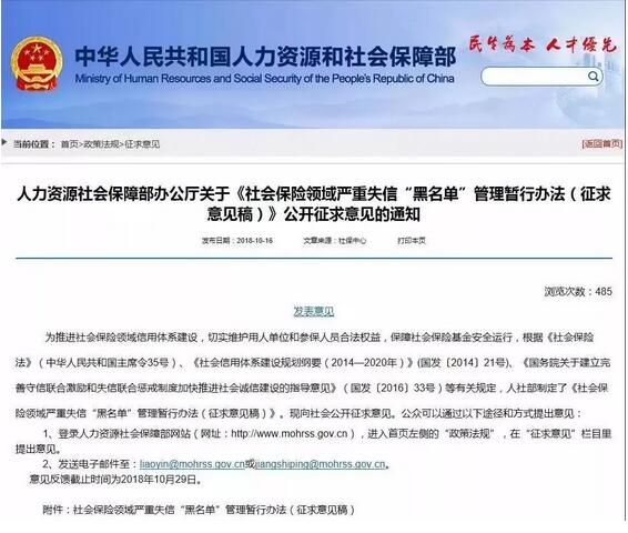 據人社部網站消息,人社部16日發布了《社會保險領域嚴重失信“黑名單”管理暫行辦法(征求意見稿)》,《意見》列舉了六種應將其列入社保“黑名單”的情形,并指出社保“黑名單”信息將被納入當地和全國信用信息共享平臺,在政府采購、交通出行、招投標、生產許可、資質審核、融資貸款、市場準入、稅收優惠、評優評先等方面予以限制。 《意見》指出,社保“黑名單”將實行“誰列入、誰管理、誰負責”,遵循依法依規、公平公正、客觀真實、動態管理的原則。 《意見》提到,有下列情形之一的單位或個人,縣級及以上社會保險經辦機構(以下簡稱經辦機構)應將其列入社保“黑名單”: (一)用人單位未按相關規定參加社會保險且拒不整改的; (二)以欺詐、偽造證明材料或者其他手段參加、申報社會保險和騙取社會保險待遇或社會保險基金支出的; (三)非法獲取、出售或變相交易社會保險個人權益數據的; (四)社會保險服務機構違反服務協議或相關規定且拒不整改的; (五)負有償還義務的用人單位及其法人代表或第三人,拒不償還社會保險基金已先行支付工傷保險待遇的; (六)法律、行政法規規定的其他情形。 《意見》指出,社保“黑名單”信息將被納入當地和全國信用信息共享平臺,由相關部門在各自職責范圍內依據《備忘錄》規定,在政府采購、交通出行、招投標、生產許可、資質審核、融資貸款、市場準入、稅收優惠、評優評先等方面予以限制。納入聯合懲戒期限一般不超過5年。 同時《意見》指出,被納入社保“黑名單”的失信主體,經辦機構可結合實際情況以適當方式督促失信主體在3個月內整改。整改到位后,失信主體可提請經辦機構確認,經辦機構應在確認后5個工作日內將其移出社保“黑名單”;整改不到位的,經辦機構應啟動警示性約談程序。經辦機構應對在規定期限內整改不到位的失信主體主要負責人進行一次警示性約談。約談記錄(包括拒絕約談或不配合約談等情形)記入失信主體信用記錄,納入全國信用信息共享平臺。