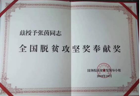 10月17日,2018年全國脫貧攻堅獎表彰大會暨首場脫貧攻堅先進事跡報告會在北京舉行,會議對99名獲獎個人和40個獲獎單位進行表彰。 經全國脫貧攻堅獎評選委員會初次評審和復評,“2018全國脫貧攻堅獎”全國設置“奮進獎”“貢獻獎”“奉獻獎”“創新獎”“組織創新獎”5個獎項。東莞的玖龍紙業(控股)有限公司董事長張茵榮獲“2018年全國脫貧攻堅奉獻獎”。據了解,奉獻獎表彰“扶貧濟困、甘于奉獻,以高度的社會責任感關心關愛貧困群眾,扶貧成效明顯,受到社會廣泛好評的先進典型。”