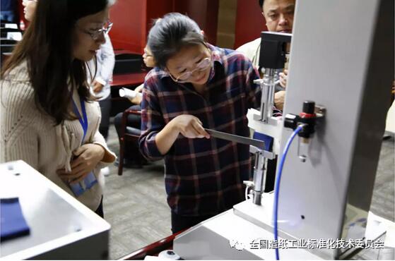 現場演示與操作 本次培訓班采用現場操作與理論講解相結合的方式教學,幫助學員提高對標準的掌握和應用能力。相關專業技術人員現場講解了衛生巾吸收速度儀和背膠剝離強度儀的工作原理、使用方法、故障排除等內容,并指導學員們進行了現場操作演示。另外,會議還安排學員參觀了國家紙張質量監督檢驗中心和制漿造紙國家工程實驗室。 按照會議日程,10月24日將繼續對GB/T20810-2018《衛生紙(含衛生原紙)》和GB/T27741-2011《紙和紙板可遷移性熒光增白劑》兩項標準進行解讀。