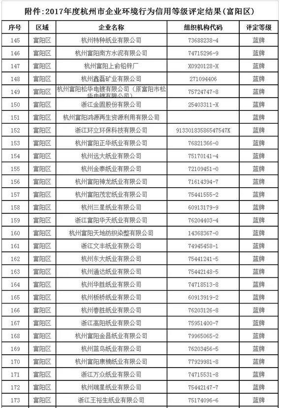 杭州市環(huán)境保護局關(guān)于公布2017年度杭州市企業(yè)環(huán)境行為信用等級評定結(jié)果的通知