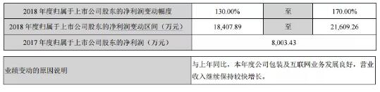 對于報告期內營業收入大幅增長的原因,吉宏股份表示主要有三點原因: 一是黃岡分公司、廊坊分公司、呼市吉宏及灤縣吉宏等公司本期營業收入較上年同期增加; 二是主要原材料中的原紙價格較上年同期上漲,包裝業務營業收入也相應增加所致; 三是上年8月新增的吉客印電商業務、本期新增龍域之星廣告業務收入增加所致。 2017年,吉宏股份歸屬于上市公司股東凈利潤為0.80億元。由于包裝機互聯網業務發展良好,營業收入繼續保持增長,吉宏股份預計2018年度公司凈利潤變動區間在1.84億元至2.16億元之間,變動幅度為130%-170%。