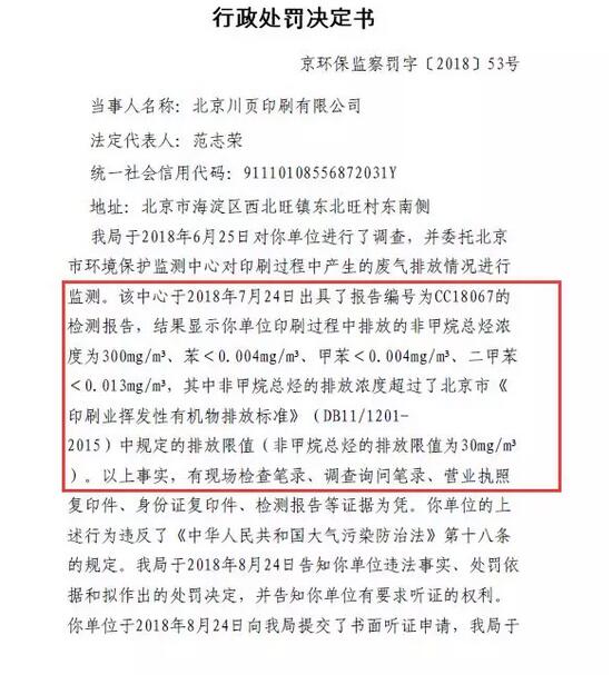 【摘要】北京環境保護局在近期發布了一份行政處罰決定書,報告稱北京川頁印刷有限公司因在印刷過程中產生的廢氣排放超標,違反國家大氣污染防治法,被重罰60萬元。