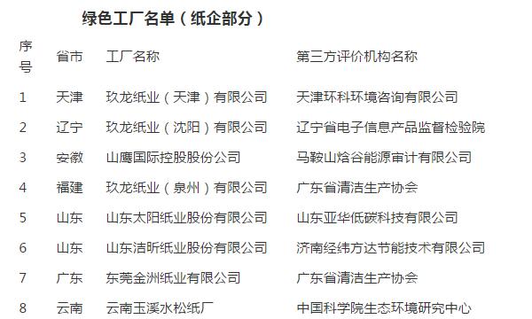 為持續打造綠色制造先進典型,引領相關領域工業綠色轉型,加快推動綠色制造體系建設,工業和信息化部開展了第三批綠色制造名單推薦工作。經申報單位自評價、第三方評價機構評價、省級工業和信息化主管部門評估確認及專家論證、公示等環節,確定了第三批綠色制造名單,共計391家企業被評為綠色工廠,其中包括了山鷹、玖龍、太陽等8家紙企,詳情如下表所示: