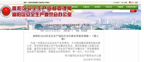 【引言】浙江省杭州市富陽區安全生產監督管理局于11月16日發布了第八批“富陽區2018年安全生產違法行為行政處罰案件通報”,被查處的單位共有17家,其中有2家造紙企業因存在生產安全隱患被責令罰款。