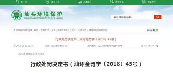 廣東一家造紙廠因環(huán)保原因,被當(dāng)?shù)丨h(huán)保局罰款100萬(wàn) 11月6日,廣東省汕頭市環(huán)保局發(fā)布《行政處罰決定書(汕環(huán)金罰字〔2018〕44號(hào))》,宣稱汕頭市騰發(fā)紙業(yè)有限公司因廢氣超標(biāo)排放,且多次受到環(huán)保違法舉報(bào),被處以罰款100萬(wàn)元整。