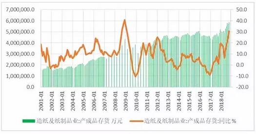 數(shù)據(jù)來源:Wind中州期貨 目前國內(nèi)進(jìn)口紙及紙制品大多為低檔包裝紙、新聞紙等,但進(jìn)口紙及紙制品的質(zhì)量一般優(yōu)于國產(chǎn)紙,且價格低于國產(chǎn)紙制品價格。外紙進(jìn)口的大幅增加,對本就低迷的市場造成進(jìn)一步的沖擊。 根據(jù)中國造紙協(xié)會的統(tǒng)計,2018年1-9月,全國生產(chǎn)各類紙張8866萬噸,同比下降7.2%。生產(chǎn)紙制品4236萬噸,同比下降21.6%,其中紙箱產(chǎn)量2121萬噸,同比下降28.3%。 1-9月份紙箱產(chǎn)量下滑28%全產(chǎn)業(yè)鏈利潤下降20%。今年1-9月份,全行業(yè)利潤同比下降20%。1-9月份,全行業(yè)主營收入1.0578萬億元,同比下降10%,利潤591億元,同比下降20%。 由于國內(nèi)經(jīng)濟(jì)下行壓力加大及出口貿(mào)易導(dǎo)致包裝用紙需求萎縮等因素影響,今年紙及紙板存貨同比增長30%以上,預(yù)計今年造紙行業(yè)生產(chǎn)和消費總量將會出現(xiàn)減少。受廢紙進(jìn)口政策逐漸加嚴(yán)及匯率變化等影響,將給造紙產(chǎn)品的生產(chǎn)和消費平穩(wěn)發(fā)展帶來不穩(wěn)定因素。 圖3:國內(nèi)造紙及紙制品存貨情況  數(shù)據(jù)來源:Wind中州期貨 前國內(nèi)瓦楞紙及箱板紙市場需求一般,成本向下轉(zhuǎn)移難度較大,進(jìn)口商利潤將遭受壓縮。 隨著原產(chǎn)于美國的瓦楞紙、箱板紙進(jìn)口量的減少,將利好國產(chǎn)高端產(chǎn)品需求釋放。特別對于規(guī)模造紙企業(yè)來說,擁有相對充足的原料供應(yīng)以及掌握先進(jìn)的生產(chǎn)設(shè)備和技術(shù),在搶占市場份額方面將更勝一籌,也將更有助于行業(yè)集中度提升。