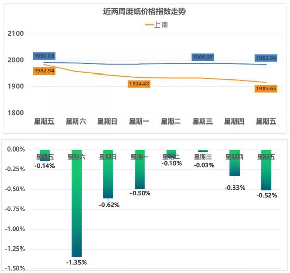 數據顯示,上周廢紙價格指數穩中下行,大部分調價紙廠仍是以下調為主。截止上周五,廢紙價格跌至1915.65。