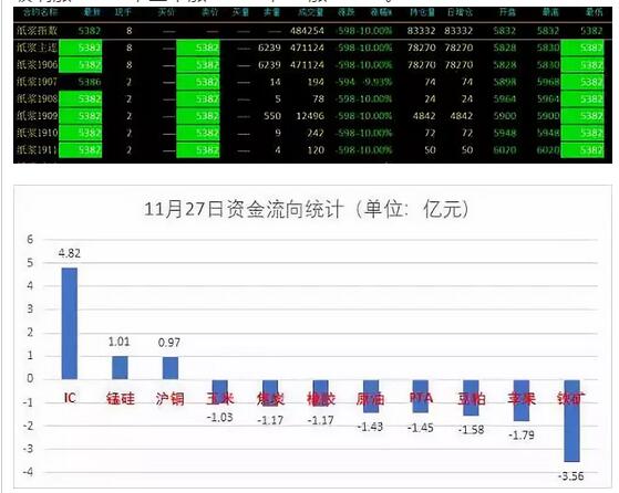 我國是紙制品的生產和消費大國,紙漿行業的市場化程度較高,但近年來紙漿價格波動劇烈,企業的避險需求強烈。對此,我國第一個紙漿期貨合約今天在上海期貨交易所掛牌交易,這也是我國期貨市場上的第50個商品期貨品種。 11月27日,紙漿期貨在上海期貨交易所上市,共掛牌6個合約,掛盤基準價5980元/噸。這次上市的紙漿期貨合約標的物是漂白針葉漿,主要用于生產印刷文化用紙、生活用紙、高檔包裝紙等。紙漿是造紙工業的重要原材料,也是國內50種流通領域重要生產資料之一,處于整個造紙產業鏈的上游,價格波動非常劇烈。 和訊期貨消息11月27日(周二)國內商品市場大面積下挫。 紙漿期貨上市首日慘遭跌停。黑色系多數走疲,鐵礦石、錳硅下探至四個半月低位,焦炭刷新四個月最低水平。農產品走勢分化,油脂油料悉數下行,其中萊粕重挫3.47%,但棉紗、白糖表現偏強,升幅在1%左右。化工品依舊弱勢,甲醇、原油跌幅近1%。 資金流向方面,國內商品呈現凈流出狀態,今日文華商品指數失血15.95億元。 黑色產業鏈品種成重災區,4.55億資金瘋狂涌出,其中鐵礦石遭到3.56億資金拋棄。化工板塊,油脂鏈同樣損失慘重,兩者均痛失逾3億資金。 截至收盤,跌幅方面,紙漿跌停,鐵礦跌3.72%,菜粕跌3.47%,錳硅跌2.83%,焦炭跌2.67%,蘋果跌2.52%,大豆跌2.48%,滬鋅跌2.36%;漲幅方面,棉紗漲1.66%,淀粉漲0.92%,白糖漲0.73%,玻璃漲0.70%,玉米漲0.46%,PP漲0.39%。