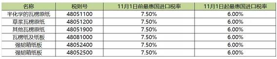 導語:從今年11月1日起,國務院決定降低1585個稅目工業品等商品進口關稅稅率,其中瓦楞及箱板紙的最惠國進口關稅稅率由7.5%降至6%,有利于降低進口商成本,緩解經濟壓力。