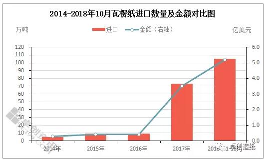 2017年后,瓦楞紙進口量大幅增長 2014-2016年瓦楞紙進口量基本在10萬噸以內,而自2017年以后隨著國內紙價上漲,瓦楞紙進口量呈現大幅增長趨勢,2018年1-10月份瓦楞紙進口量達到了105.61萬噸,同比大幅上漲214.50%。其中2018年5月份國內瓦楞紙均價達到了4936元/噸,進口瓦楞紙憑借低廉的價格大大提振貿易商進口的熱情,自5月份起月內進口量持續在10萬噸以上。