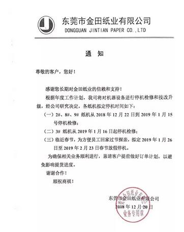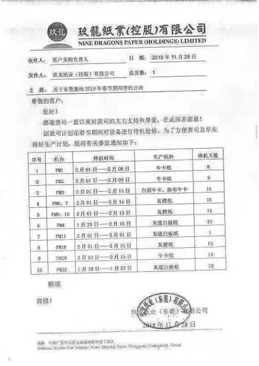 11月28日,東莞玖龍發(fā)布2019年春節(jié)期間停機(jī)函:2019年1月18日到2月15日期間,全廠共12臺(tái)紙機(jī)分別停機(jī)1-23天不等。