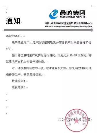 導(dǎo)語:12月20日,東莞金田、湛江晨鳴發(fā)布停機(jī)計(jì)劃,加上此前玖龍、理文、建暉紙業(yè),至少5家紙企2019年1月中下旬至2月中旬期間有停機(jī)計(jì)劃,今年的停機(jī)時(shí)間相比去年有所增加。此外,有報(bào)道稱,為了應(yīng)對(duì)霧霾天氣,本是豁免企業(yè)的揚(yáng)州永豐余主動(dòng)減產(chǎn)50%。種種跡象,不得不讓人聯(lián)想到當(dāng)前包裝紙需求的疲軟。 東莞金田、湛江晨鳴最新停機(jī)計(jì)劃出爐! 12月20日,東莞金田紙業(yè)和晨鳴集團(tuán)分別發(fā)布停機(jī)檢修計(jì)劃,金田紙業(yè)同時(shí)發(fā)布了近期的停機(jī)檢修計(jì)劃及春節(jié)停機(jī)時(shí)間,湛江晨鳴則是所有機(jī)臺(tái)停機(jī)一周!對(duì)此,有行業(yè)人士表示,“嗅到了市場(chǎng)需求萎縮的氣息。”