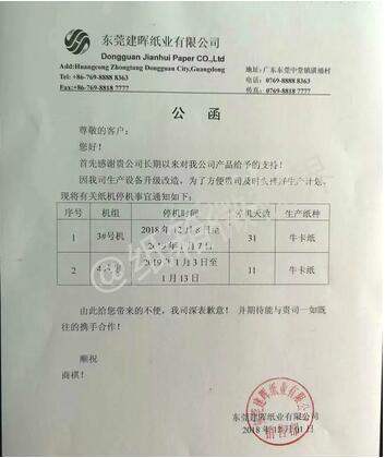 晨鳴集團(tuán):鑒于湛江晨鳴生產(chǎn)線實(shí)際運(yùn)行情況,計(jì)劃2019年1月10-18日期間,湛江晨鳴所有機(jī)臺(tái)全部停機(jī)檢修。 2019年1月至2月將迎來停機(jī)高峰 11月底12月初,龍頭紙企的停機(jī)函紛至沓來,大多是2019年春節(jié)期間的停機(jī)計(jì)劃。 12月1日,東莞建暉紙業(yè)有限公司發(fā)布停機(jī)公函:兩臺(tái)牛卡紙機(jī),PM3將在2018年12月8日-2019年1月7日停機(jī),停機(jī)31天;PM4的停機(jī)時(shí)間為2019年1月3日-1月13日,停機(jī)11天。