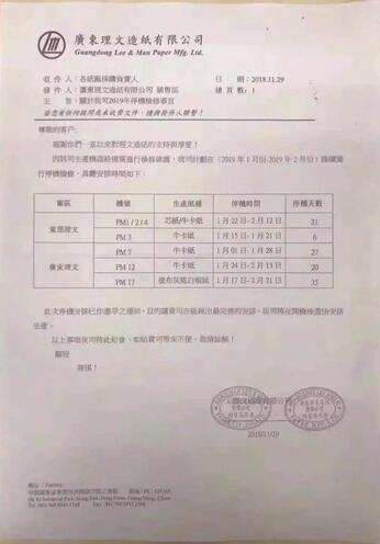 11月29日,理文發(fā)布停機(jī)函:2019年1月1日至2月21日期間,東莞理文、廣東理文芯紙、牛卡紙、涂布灰底白板紙7臺(tái)紙機(jī)分別停機(jī)6-35天。