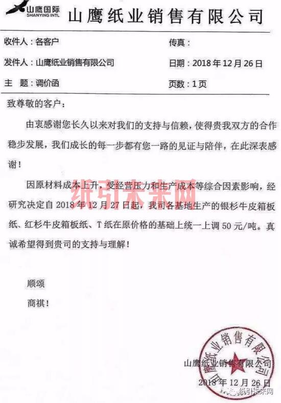 在國廢漲勢下,山鷹紙業(yè)宣布從今天起各基地生產(chǎn)的箱板紙上調(diào)50元/噸。但另外一邊,廣東地區(qū)幾家紙企卻逆勢下調(diào)廢紙價格,其中廣東玖龍下調(diào)幅度最大,為100元/噸,同時公布了1月份的停機計劃。 一、山鷹紙業(yè)從今天開始原紙漲50元/噸,東莞玖龍公布最新的停機計劃 山鷹紙業(yè)銷售有限公司:因原材料成本上升,受經(jīng)營壓力和生產(chǎn)成本等綜合因素影響,決定自2018年12月27日起,我司各基地生產(chǎn)的銀杉牛皮箱板紙、紅杉牛皮箱板紙、T紙在原價格的基礎(chǔ)上統(tǒng)一上調(diào)50元/噸。