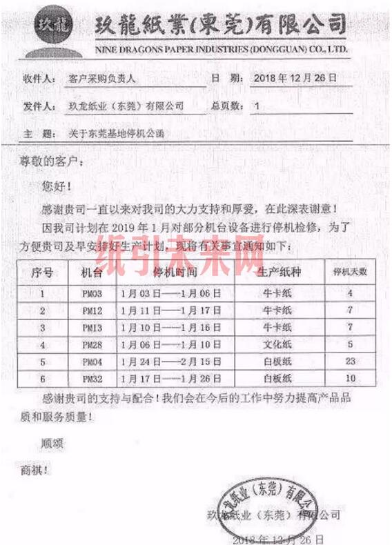 東莞玖龍紙業(yè)有限公司:因我司計劃在2019年1月對部分機臺設(shè)備進(jìn)行停機檢修,為了方便貴司及早安排好生產(chǎn)計劃,現(xiàn)將有關(guān)事宜通知如下:1、PM03機臺停機時間為1月3日——1月6日,停機天數(shù)為4天,主要生產(chǎn)牛卡紙;2、PM12停機時間為1月11日-17日,停機7天,生產(chǎn)牛卡紙;3、PM13停機時間為1月10日——1月16日,停機7天,主要生產(chǎn)牛卡紙;4、PM28停機時間為1月6日——1月10日,停機5天,主要生產(chǎn)文化紙;5、PM04停機時間1月24日——2月15日,停機23天,主要生產(chǎn)白板紙;6、PM32停機時間為1月17日——1月26日,停機10天,主要生產(chǎn)白板紙。