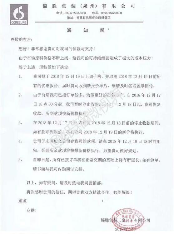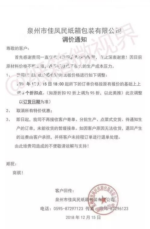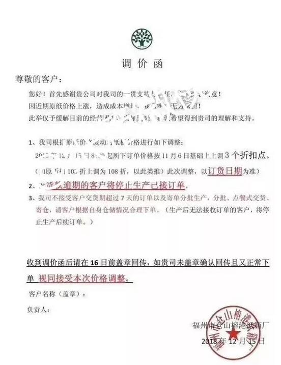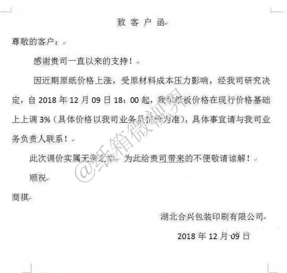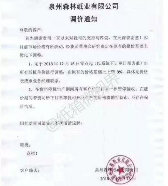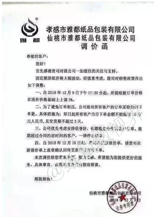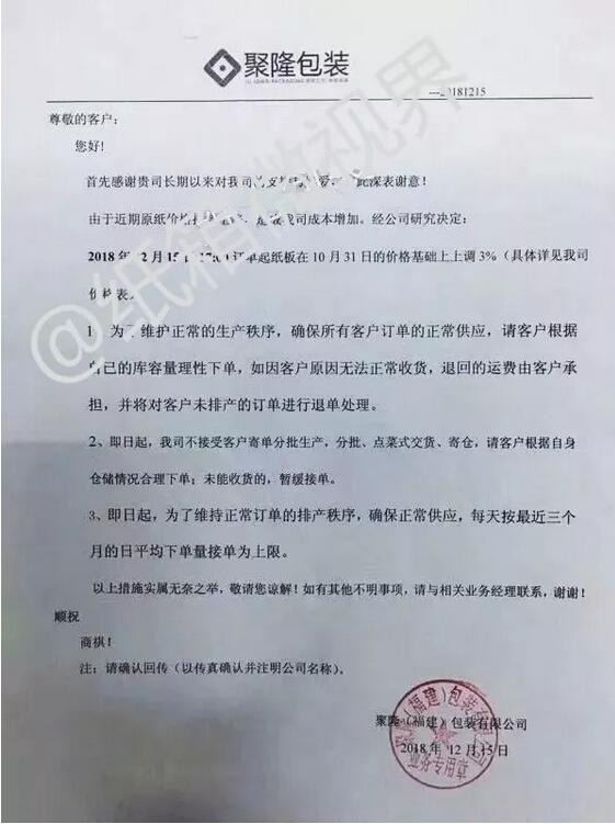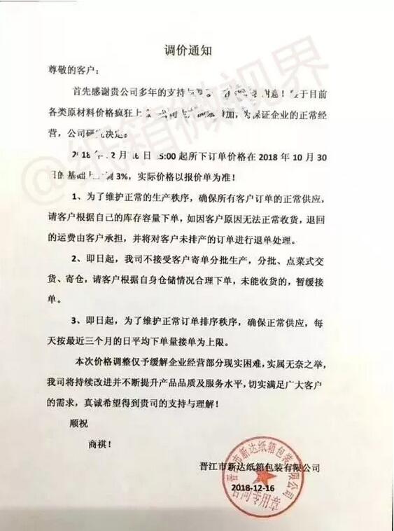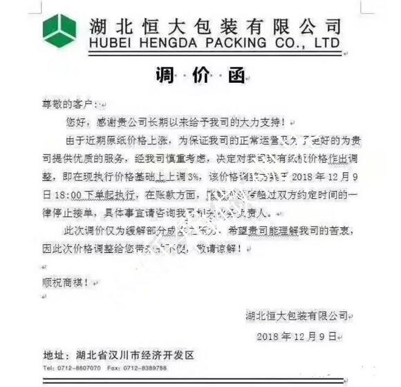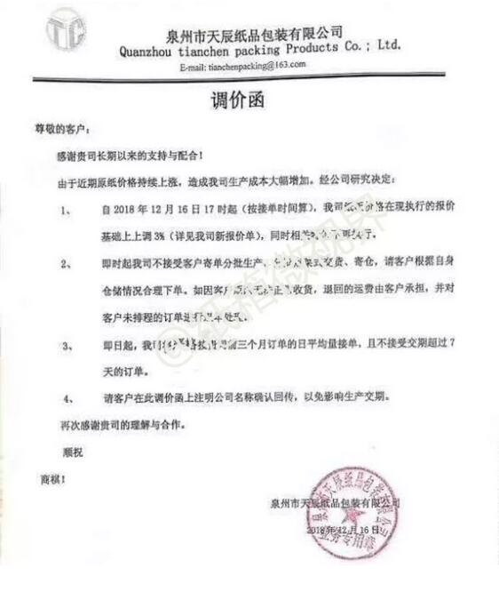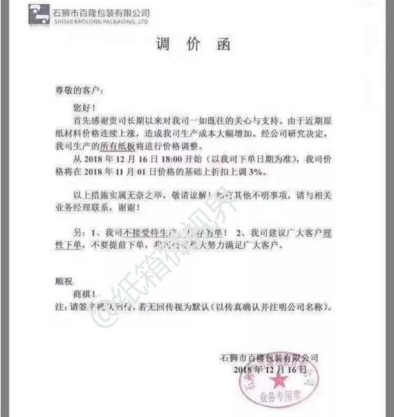 12月份因原紙暴漲,又有3家紙板廠發(fā)布漲價函,目前,紙板漲價函已增至21張,多漲3%,部分上漲100元/噸,另有部分漲1.7元/平方!77張原紙、紙板漲價函滿天飛,國廢上漲情緒下原紙、紙板漲價還將繼續(xù),紙箱廠頂不住了!! 杭州三星紙業(yè)有限公司:12月21日起,灰板紙出廠價統(tǒng)一上漲100元/噸(未交付的訂單也在漲價范圍內(nèi))。到期貨款未付清一律停止發(fā)貨。 溫州鴻馬包裝有限公司:12月20日上午11:00起,所有預(yù)付款和月結(jié)客戶價格在11月5日標(biāo)準(zhǔn)價基礎(chǔ)上上漲。細(xì)瓦二層瓦楞紙板上調(diào)0.05元/平方,細(xì)瓦三層紙板上調(diào)0.05元/平方。 宿州龍發(fā)包裝有限公司:12月19日17:30接單起(以單到款到為準(zhǔn))所有紙板價格在原折扣上上調(diào)3個點。 據(jù)小編不完全統(tǒng)計,除以上新增的3家紙板廠的漲價函外,不到10天,已有18家紙板廠發(fā)布漲價通知。 換句話說,目前,紙板漲價函已增至21張。紙板多漲3%,部分上漲100元/噸,另有部分漲1.7元/平方!