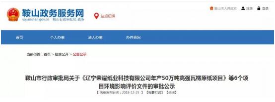 遼寧省鞍山市政務服務網于12月25日發布了關于《遼寧榮耀紙業科技有限公司年產50萬噸高強瓦楞原紙項目》環境影響評價文件的審批公示,項目總投資約9.5億,可年產高強瓦楞原紙50萬噸。