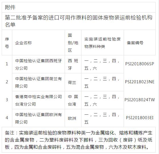 根據《進口可用作原料的固體廢物檢驗檢疫監督管理辦法》和《進口可用作原料的固體廢物裝運前檢驗監督管理實施細則》規定,現將第二批準予備案的進口可用作原料的固體廢物裝運前檢驗機構名單(見附件)予以公布。