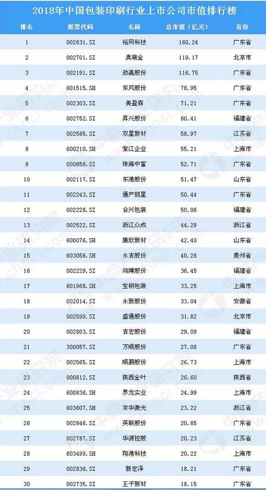 截止到2018年12月28日,2018年中國包裝印刷行業上市公司總市值排名前十的企業有:裕同科技、奧瑞金、勁嘉股份、東風股份、美盈森、昇興股份、雙星新材、紫江企業、珠海中富、東港股份。 值得關注的是,2018年中國包裝印刷行業上市公司總市值排行榜主要統計了33家滬深上市企業的市值排名,其中,總市值超百億元的僅三家,2018年中國包裝印刷行業上市公司總市值居第一的是來自廣東省的裕同科技,市值達160.24億元。奧瑞金市值居第二,市值為119.17億元。勁嘉股份市值居第三,市值為116.75億元。