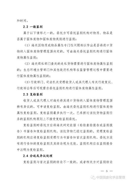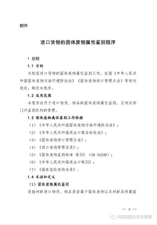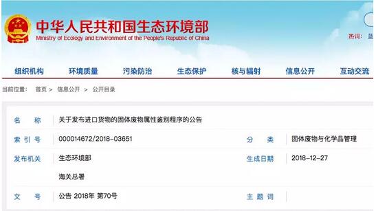 生態環境部 中華人民共和國海關總署 公告2018年第70號 關于發布進口貨物的固體廢物屬性鑒別程序的公告 為貫徹《中華人民共和國固體廢物污染環境防治法》和《固體廢物進口管理辦法》,加強進口固體廢物的環境管理,規范進口貨物的固體廢物屬性鑒別工作,現發布《進口貨物的固體廢物屬性鑒別程序》(見附件)。 該程序自發布之日起實施,《關于發布固體廢物屬性鑒別機構名單及鑒別程序的通知》(環發〔2008〕18號)同時廢止。 特此公告。 附件:進口貨物的固體廢物屬性鑒別程序 生態環境部 海關總署 2018年12月26日 主送:各省、自治區、直轄市生態環境廳(局),新疆生產建設兵團環境保護局,海關總署廣東分署、天津特派辦、上海特派辦、各直屬海關。 抄送:發展改革委,商務部。 生態環境部辦公廳2018年12月27日印發 附件1:進口貨物的固體廢物屬性鑒別程序