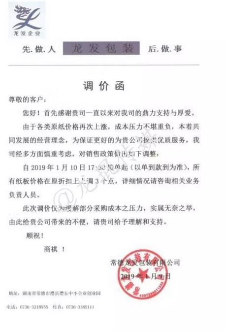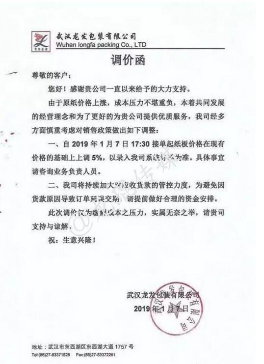 武漢龍發(fā)包裝有限公司 自2019年1月7日17:00接單起,紙板價(jià)格在現(xiàn)有基礎(chǔ)上上調(diào)5%。