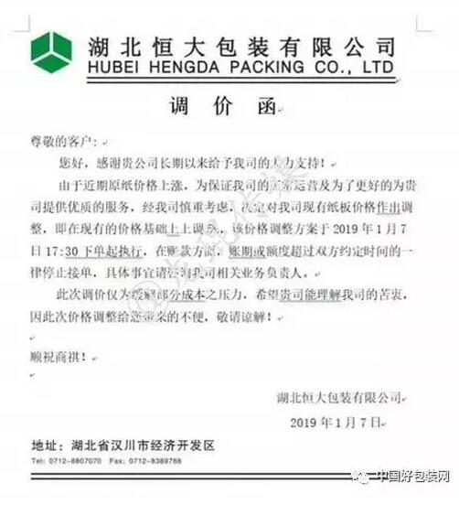 湖北恒大包裝有限公司 自2019年1月7日17:30下單起,紙板價(jià)格在現(xiàn)有基礎(chǔ)上上調(diào)5%。賬期或額度超過(guò)雙方約定時(shí)間的一律停止接單。