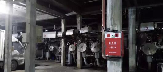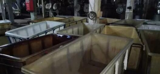 上千平方米的廠房?jī)?nèi),洗染設(shè)備全部停止生產(chǎn)運(yùn)轉(zhuǎn),用于運(yùn)輸印染紡織物的塑料推車全部存放一邊,工廠地面清洗比較干凈,污水排放口已見(jiàn)不到污水排放。