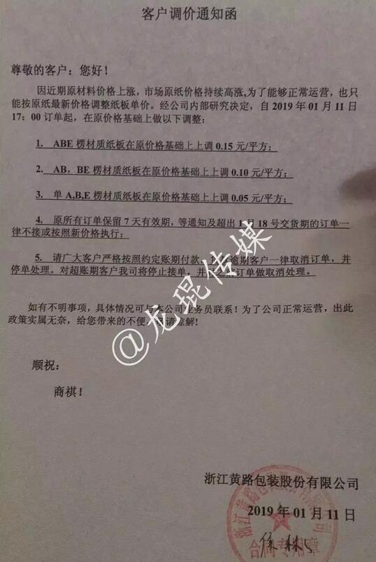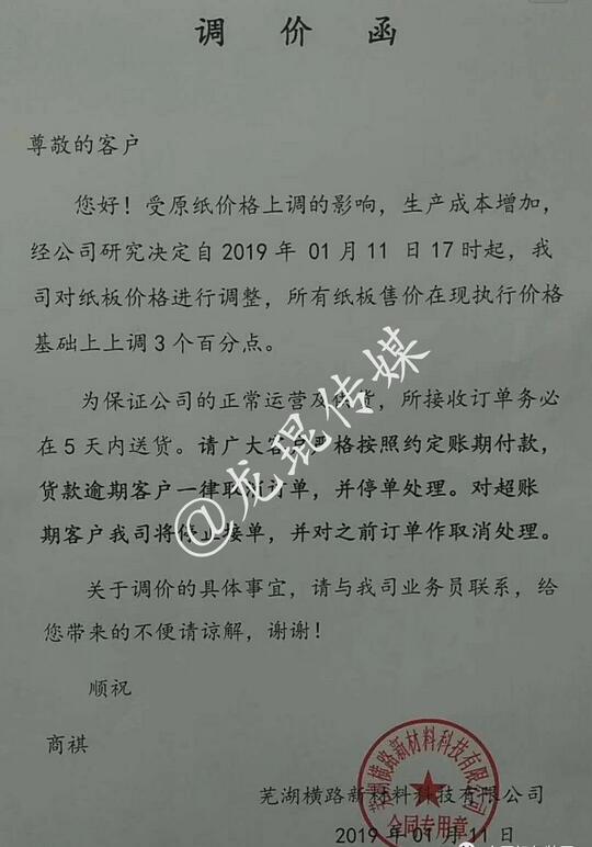 蕪湖橫路新材料有限公司 自2019年1月11日17點(diǎn)起,所有紙板售價(jià)在現(xiàn)執(zhí)行價(jià)格基礎(chǔ)上上調(diào)3個(gè)百分點(diǎn)。