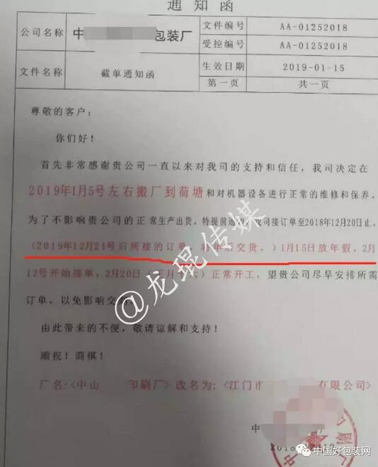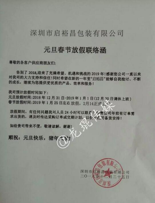 此外,浙江宇暢包裝有限公司還發(fā)布了放假通知,表示2019年1月19日17:00將停止接單,2019年2月15日開始接單。如今時(shí)間已至1月12號,距離浙江宇暢包裝有限公司放假僅有一個(gè)星期的時(shí)間。