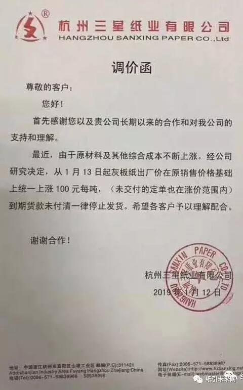杭州三星紙業(yè)有限公司:最近,由于原材料及其他綜合成本不斷上漲。經公司研究決定,從1月13日起灰板紙出廠價在原銷售價格基礎上統(tǒng)一上漲100元每噸,(未交付的定單也在漲價范國內)到期貨款未付清一律停止發(fā)貨。希望各客戶予以理解配合。