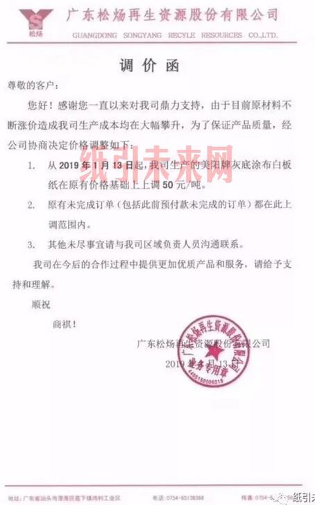 廣東松煬再生資源股份有限公司:由于目前原材料不斷漲價造成我司生產成本均在大幅攀升,為了保證產品質量,經公司協(xié)商決定價格調整如下:1.從2019年1月13日起,我司生產的美陽牌灰底涂布白板紙在原有價格基礎上上調50元/噸。2.所有未完成訂單(包括此前預付款未完成的訂單)都在此上調范圍內。