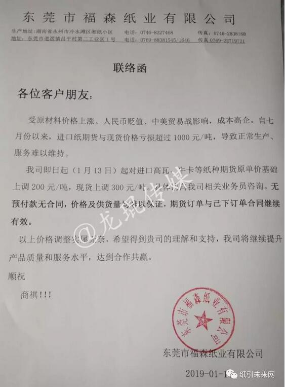 1月14日,東莞市福森紙業(yè)有限公司發(fā)布漲價函:自七月份以來,進口紙期貨與現(xiàn)貨價格虧損超過1000元/噸,導致正常生產、服務難以維持。1月13日起,對進口高瓦、牛卡等紙種期貨原單價基礎上調200元/噸,現(xiàn)貨上調300元/噸。