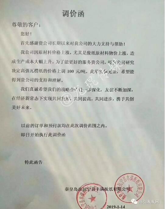 秦皇島撫寧縣豐滿紙板有限公司:從2019年1月14日起,高強瓦楞紙價格上調100元/噸。