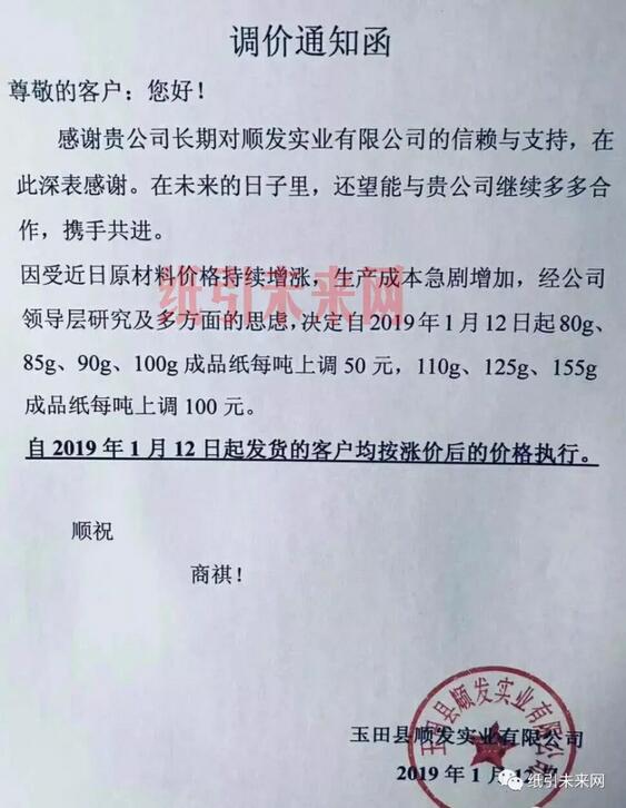 山東天和紙業(yè)有限公司:近期我公司持續(xù)受原材料、能源等多種因素影響,生產成本升幅較大,為確保貴我雙方互共贏,產品品質持續(xù)穩(wěn)定,經公司董事會研究決定:自2019年1月13目起,我司生產的低定量文化用紙:本白雙面膠版印刷紙及薄冊紙在原價格上調100元/噸,高白和深黃的雙面膠版及薄冊紙在原價格上調200元/噸。