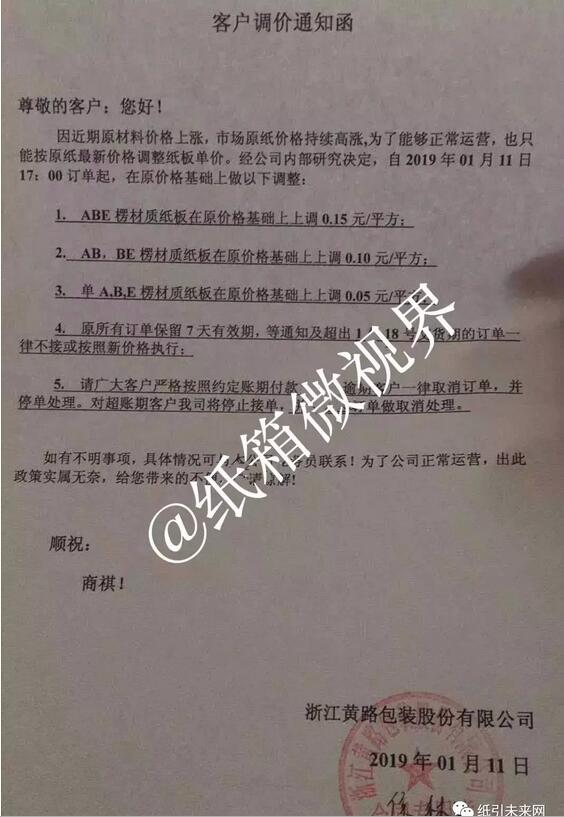 二、又4家紙板廠發(fā)布漲價函,貨款逾期及超賬期客戶取消并停單 1月11日,浙江黃路包裝股份有限公司發(fā)布漲價函:自2019年1月11日17:00起,ABE楞材質紙板在原價格基礎上上調0.15元/平方;AB、BE楞材質紙板在原價格基礎上上調0.10元/平方;單A、B、E楞材質紙板在原價格基礎上上調0.05元/平方。貨款逾期客戶一律取消訂單,并停單處理。超賬期客戶停止接單,并對之前訂單做取消處理。