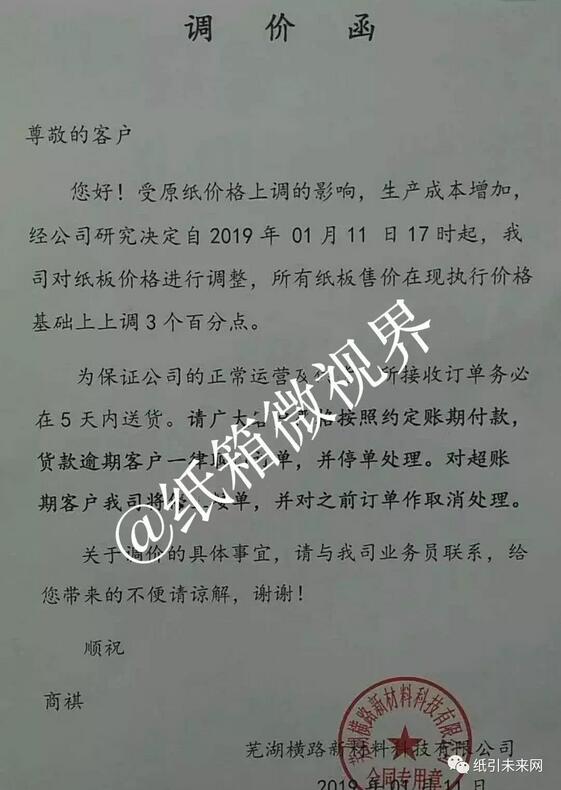 1月11日,蕪湖橫路新材料有限公司發(fā)布漲價函:1月11日17點起,所有紙板售價在現(xiàn)執(zhí)行價格基礎上上調3個百分點。貨款逾期客戶一律取消訂單,并停單處理。超賬期客戶停止接單,并對之前訂單做取消處理。