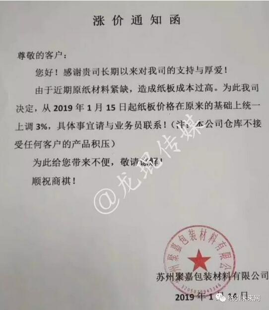 蘇州聚嘉包裝材料有限公司:從2019年1月15日起,紙板價格在原來的基礎上同意上調3%。