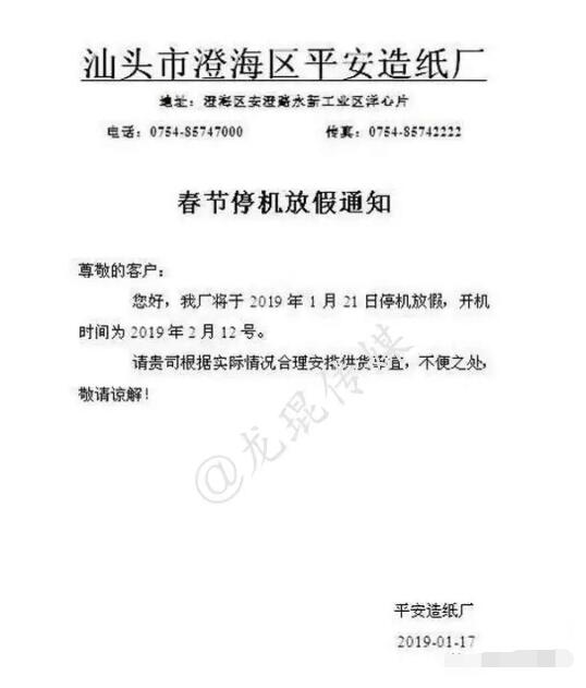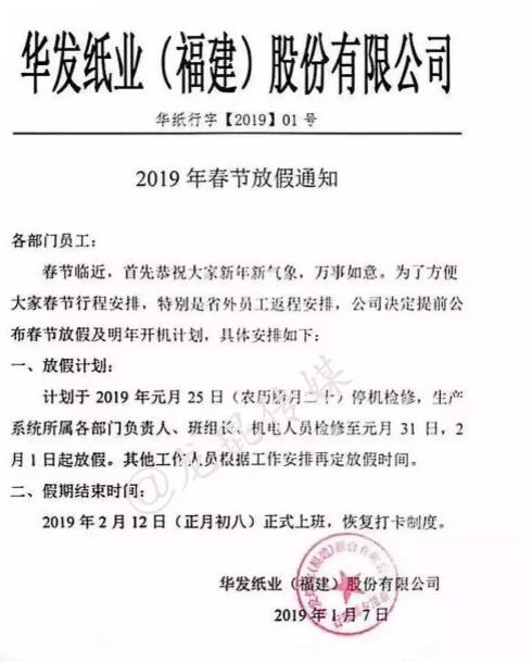 而在此前的1月7日,華發(fā)紙業(yè)(福建)股份有限公司也稱,將從2月1日起開始放假,2月12日正式上班。