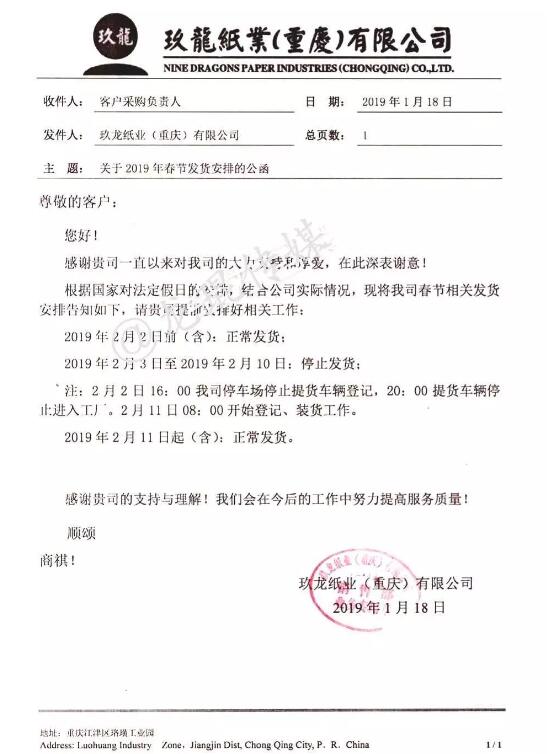 玖龍紙業(yè)(重慶)有限公司 2019年2月2日前(含):正常發(fā)貨; 2019年2月3日至2019年2月10日:停止發(fā)貨; 2月2日16:00停車場(chǎng)停止提貨車輛登記,20:00提貨車輛停止進(jìn)入工廠;2月11日:8:00開始登記、裝貨工作; 2019年2月11日起(含):正常發(fā)貨。