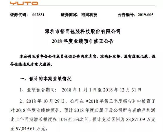 1月18日,裕同科技發(fā)布業(yè)績預(yù)告,公司預(yù)計2018年1-12月歸屬上市公司股東的凈利潤9.32億至9.78億,同比變動0.00%至5.00%,包裝印刷行業(yè)平均凈利潤增長率為10.75%。